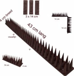 - Flexibele installatie: gebruik spijkers / schroeven, dubbelzijdig plakband, silicone kit en sterke kabelbinders om de dieren af te schrikken op elk vlak oppervlak, zoals hekken / leuningen / dak / schuren / muren / poorten / richels, enz. Ze zijn eenvoudig te monteren.