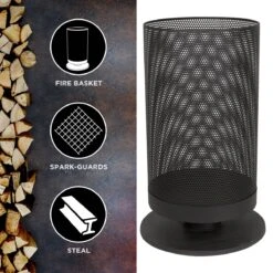 Deze zwarte, stalen terrashaard is een elegante cilinder op voet. Het vonkenscherm zorgt ervoor dat de vonken in de korf blijven, terwijl je door de kleine gaatjes goed zicht hebt op het vuur, wat extra sfeer geeft. Je krijgt er ook een pook bij.