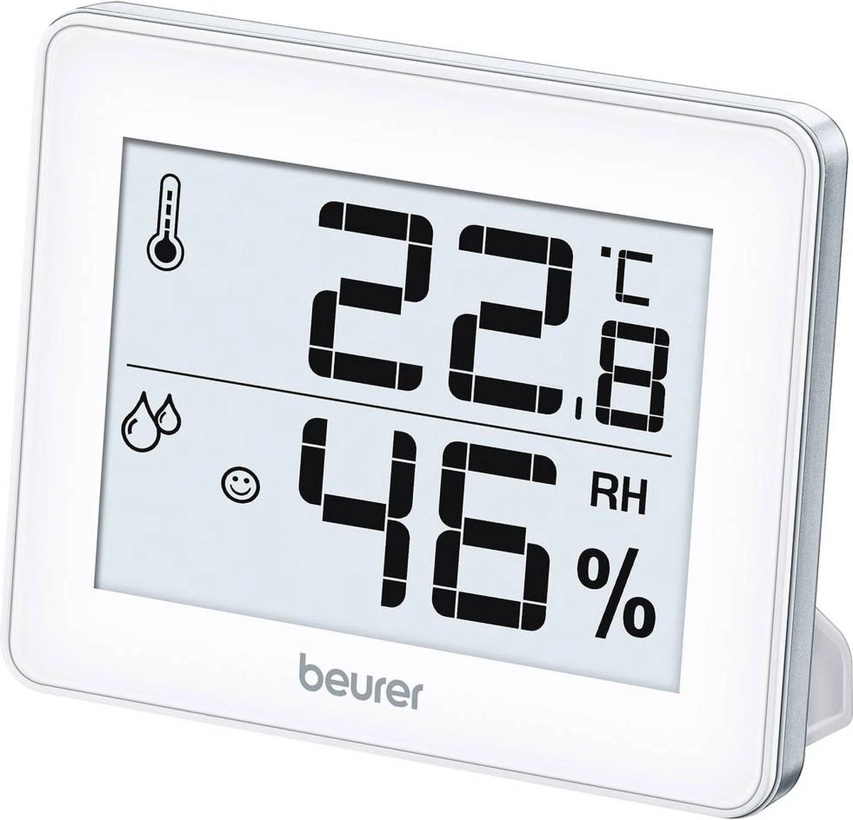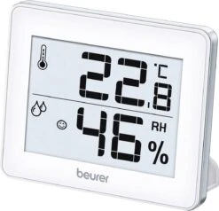 Met de Beurer HM16 meet je de kamertemperatuur en luchtvochtigheid. Het grote display is eenvoudig af te lezen, met handige smiley indicator. De smiley op het display geeft de actuele omgevingscondities weer: