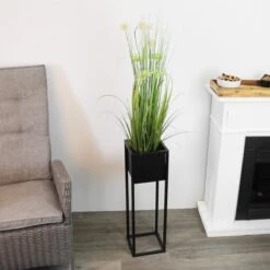 De verfijnde plantenbak van Home&Styling bestaat uit een bloempot op een stevige maar elegante standaard, beide gemaakt van zwart geverfd metaal.