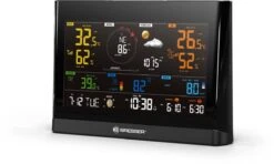 Met zijn kleurrijke display en elegante design biedt het Bresser WLAN Comfort weerstation met 7-in-1 professionele sensor u een perfect overzicht van tijd en weer. Door de contrastinstelling van het LCD-display kunt u op het 5,7″ kleurendisplay vanuit vrijwel elke kijkhoek de tijd, de dag van de week, de maanfasen, de zonsopgang en de zonsondergang aflezen. De 7-in-1 professionele buitensensor zendt de gemeten waarden voor windsnelheid, windrichting, vochtigheid, temperatuur, neerslaghoeveelheid, evenals UV-niveau en lichtintensiteit betrouwbaar via 868 MHz frequentie naar het basisstation. Door de interne opslag en analyse van de meetgegevens wordt met behulp van grafische symbolen een betrouwbare lokale weertrendvoorspelling voor de komende 12 uur weergegeven. Er kan ook een extra alarm worden geactiveerd voor vorst-/ijswaarschuwing. De WLAN-functie stelt gebruikers in staat hun lokale gegevens te delen via Apps zoals ”Weather Underground” of ”Weather Cloud”. Bovendien maakt de WLAN-functie tijdsynchronisatie via internet mogelijk, evenals firmware-updates. Dit station kan ook worden aangesloten op het Duitstalige portaal AWEKAS. Optioneel kunt u uw weergegevens overbrengen naar AWEKAS of uw weergegevens daar wereldwijd opvragen.