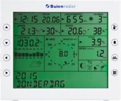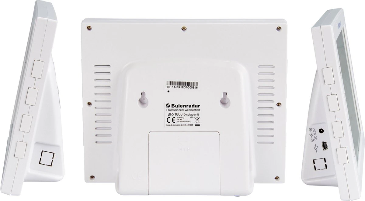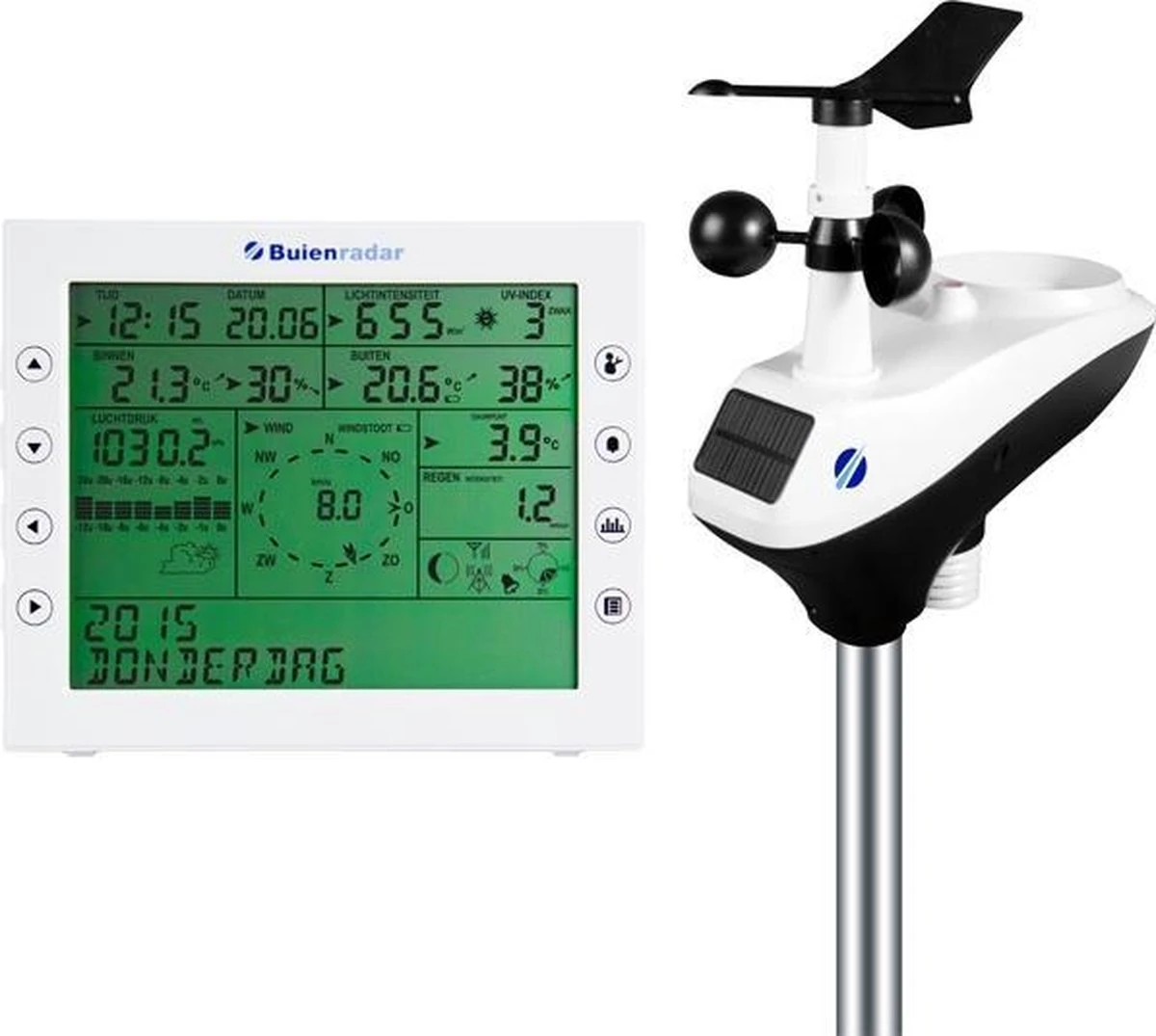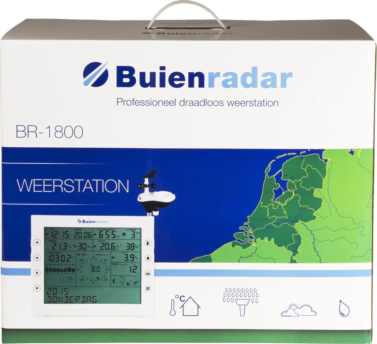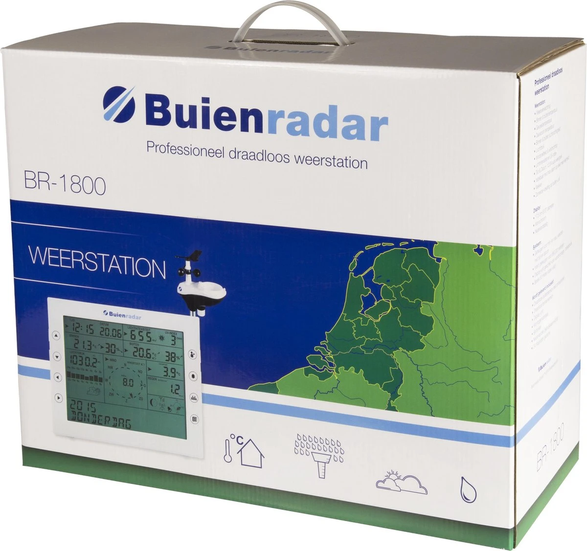 Met het BR-1800 thuis weerstation van Buienradar wordt professionele weermeting voor elke weerenthousiateling mogelijk. Hij bestaat uit een mast met verschillende sensoren voor buiten (de buitenunit) en een prachtig meetdisplay voor binnen.