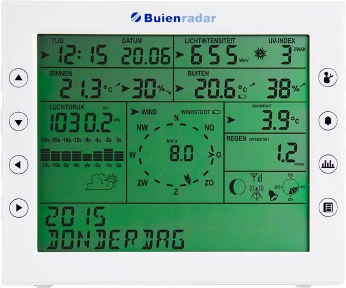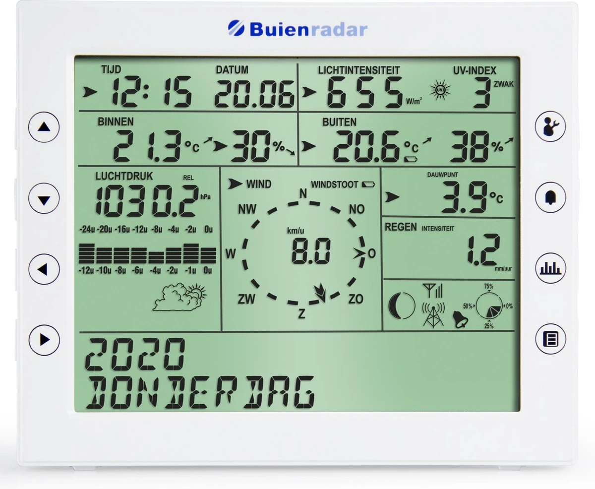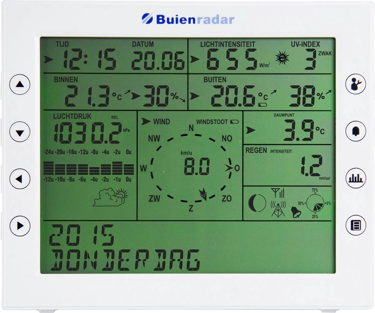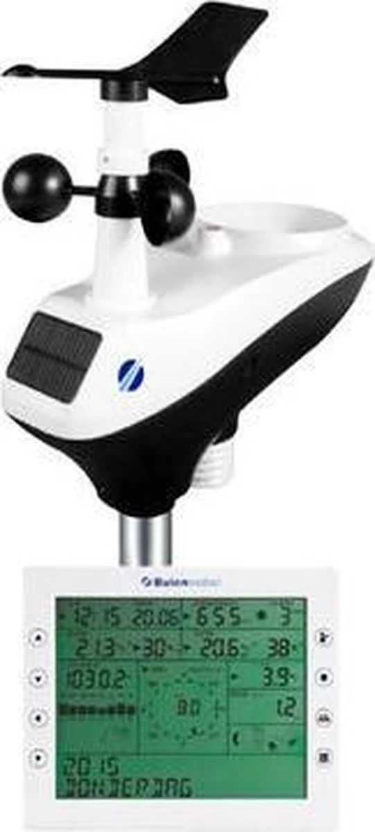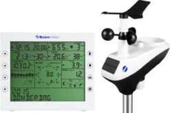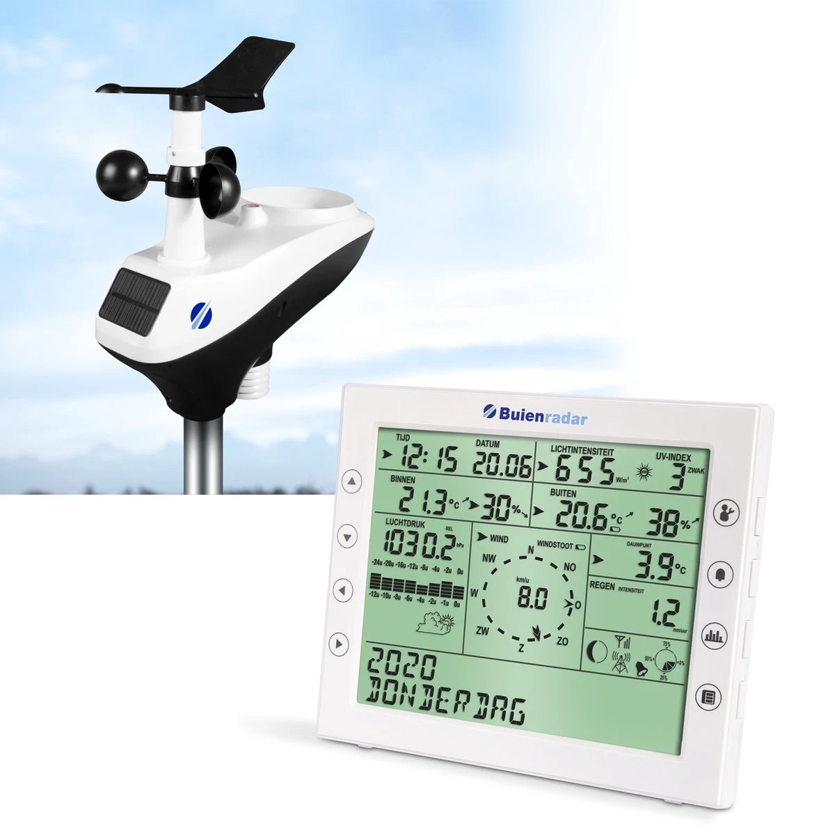 Met het BR-1800 thuis weerstation van Buienradar wordt professionele weermeting voor elke weerenthousiateling mogelijk. Hij bestaat uit een mast met verschillende sensoren voor buiten (de buitenunit) en een prachtig meetdisplay voor binnen.