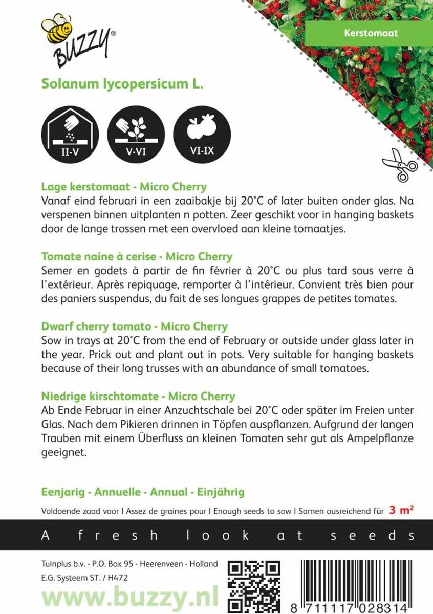 Tomaat ‘Micro Cherry’ (Solanum lycopersicum) is een heel smaakvolle, fijne cherrytomaat. Dit tomatensoort is ideaal voor op het terras of balkon in potten of hanging baskets. Tomaat ‘Micro Cherry’ is zeer productief en gemakkelijk te telen. Een heerlijk zoet pluktomaatje!