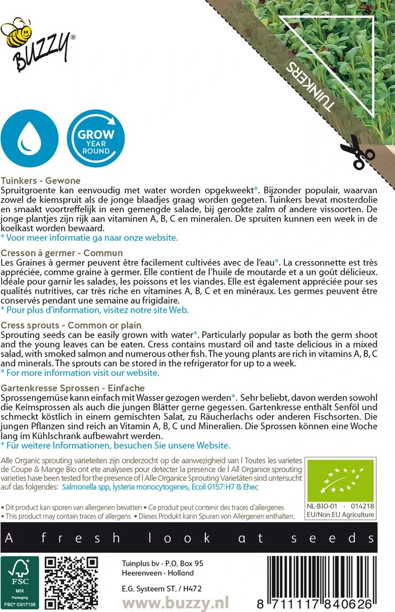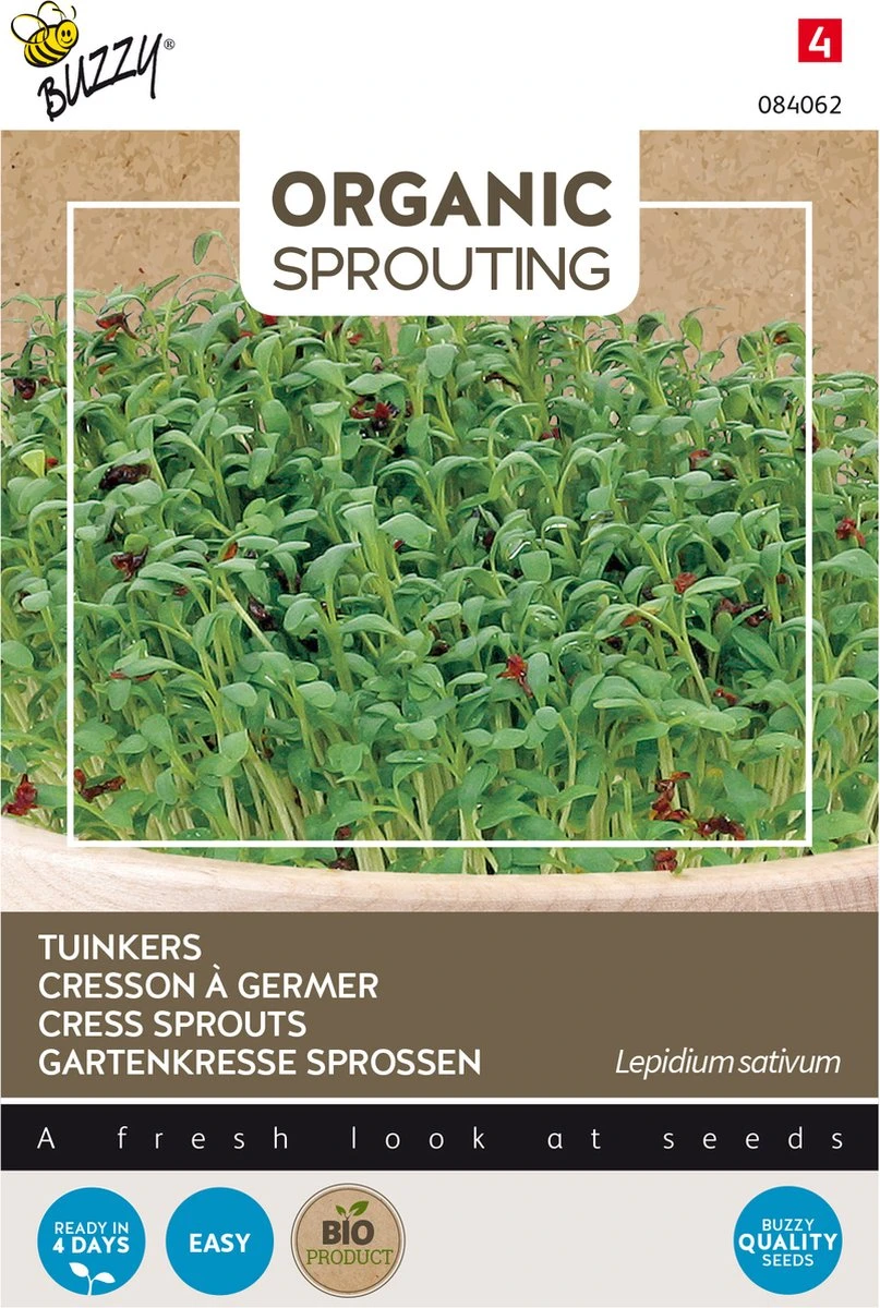 LET OP! Basilicum, rucola en tuinkers maken een gel aan na aanraking met water. Minder geschikt voor sprouting in de spruitgroente pot, waarbij afgegoten moet worden. Wij adviseren deze soorten te sprouten d.m.v. het mengen met alfalfa en of radijskers en of broccolikers.