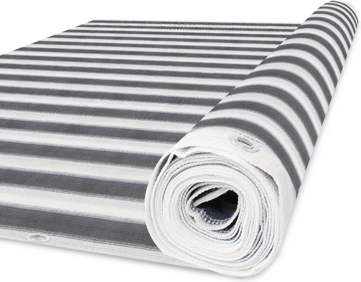 Onze grijs-wit gestreepte balkonscherm van Casa Pura biedt u optimale bescherming tegen blikken, wind en zon. Hij kan aan hekwerken aangebracht worden of dient als design afscheiding van zithoekjes in de tuin.