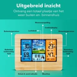 Met het weerstation van Clockity ben je altijd op de hoogte van de huidige binnen- en buitentemperatuur, het voorspelde weer, de luchtvochtigheid, de maanstand en de huidige tijd, dag en datum. Dit is allemaal overzichtelijk te zien op het duidelijke scherm. Daarnaast is dit compacte weerstation een unieke aanvulling in huis. De meegeleverde buitensensor heeft een bereik tot wel 60 meter.