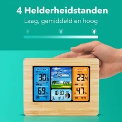 De helderheid van het weerstation kan ingesteld worden naar laag, gemiddeld of hoog. Handige functie om voor elke gewenste plek in huis een passende helderheid te kiezen.