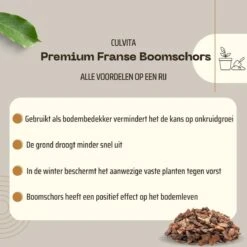 Culvita Franse Boomschors is een schors van hoge kwaliteit. Door de harde structuur gaat het jaren mee. Franse Boomschors is niet alleen functioneel, maar geeft uw tuin een eigentijds gezicht.