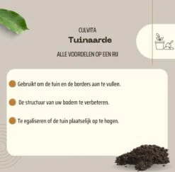 Culvita Tuinaarde wordt gebruikt om de tuin en in het bijzonder de borders aan te vullen, te egaliseren of de tuin plaatselijk op te hogen. Bovendien kunt u met deze tuinaarde de structuur van uw bodem verbeteren.
