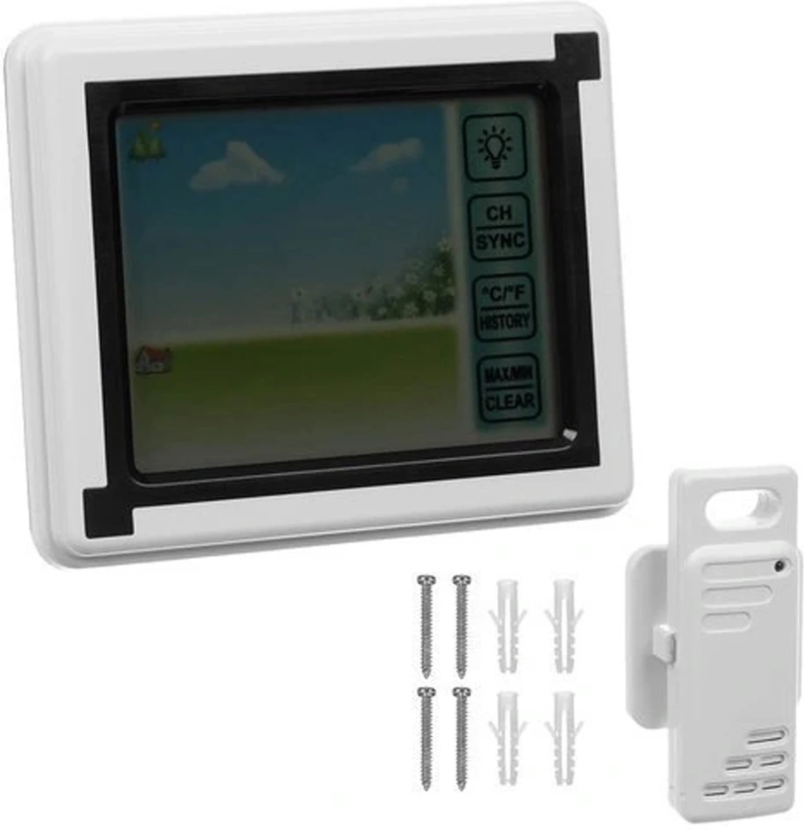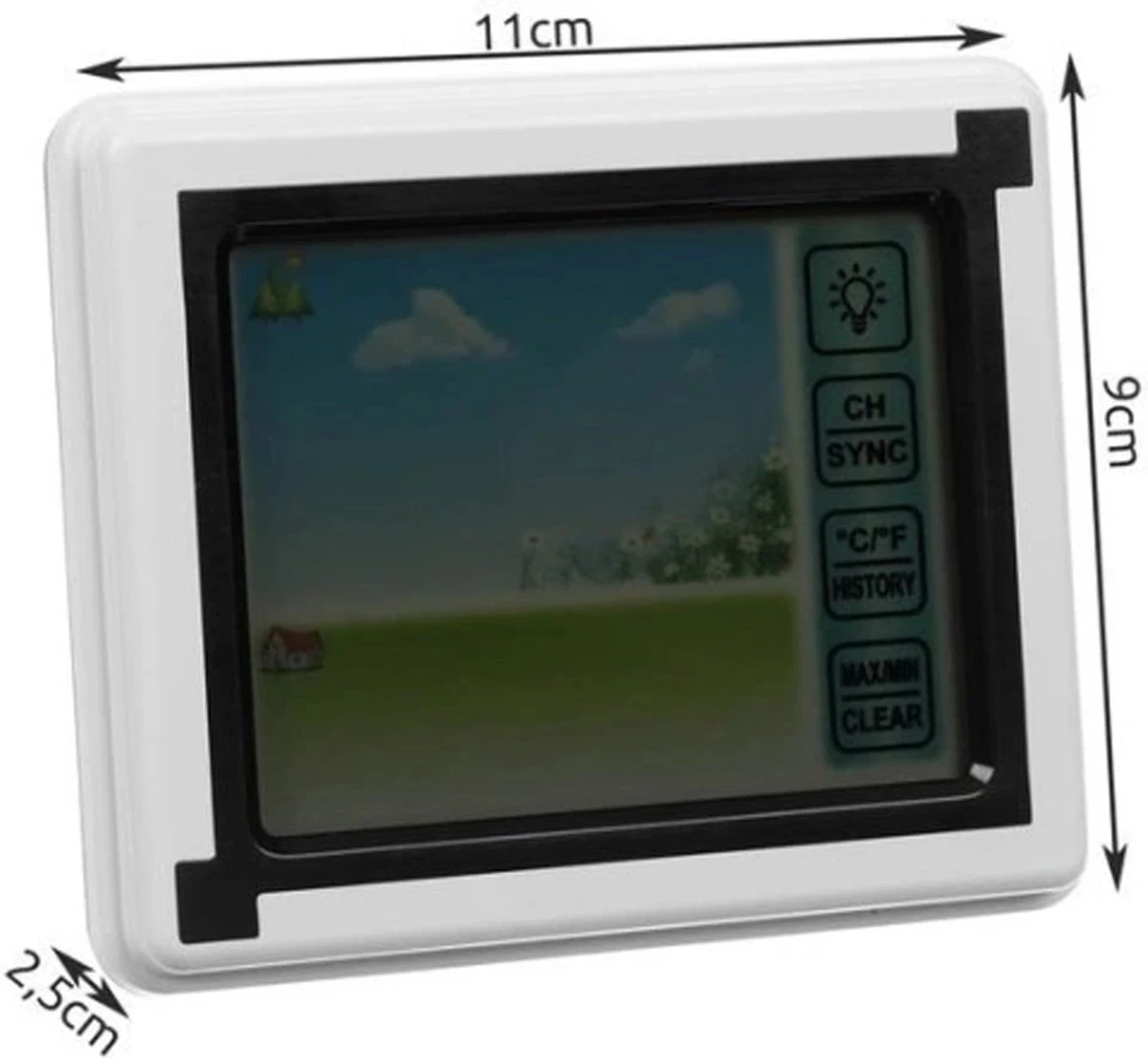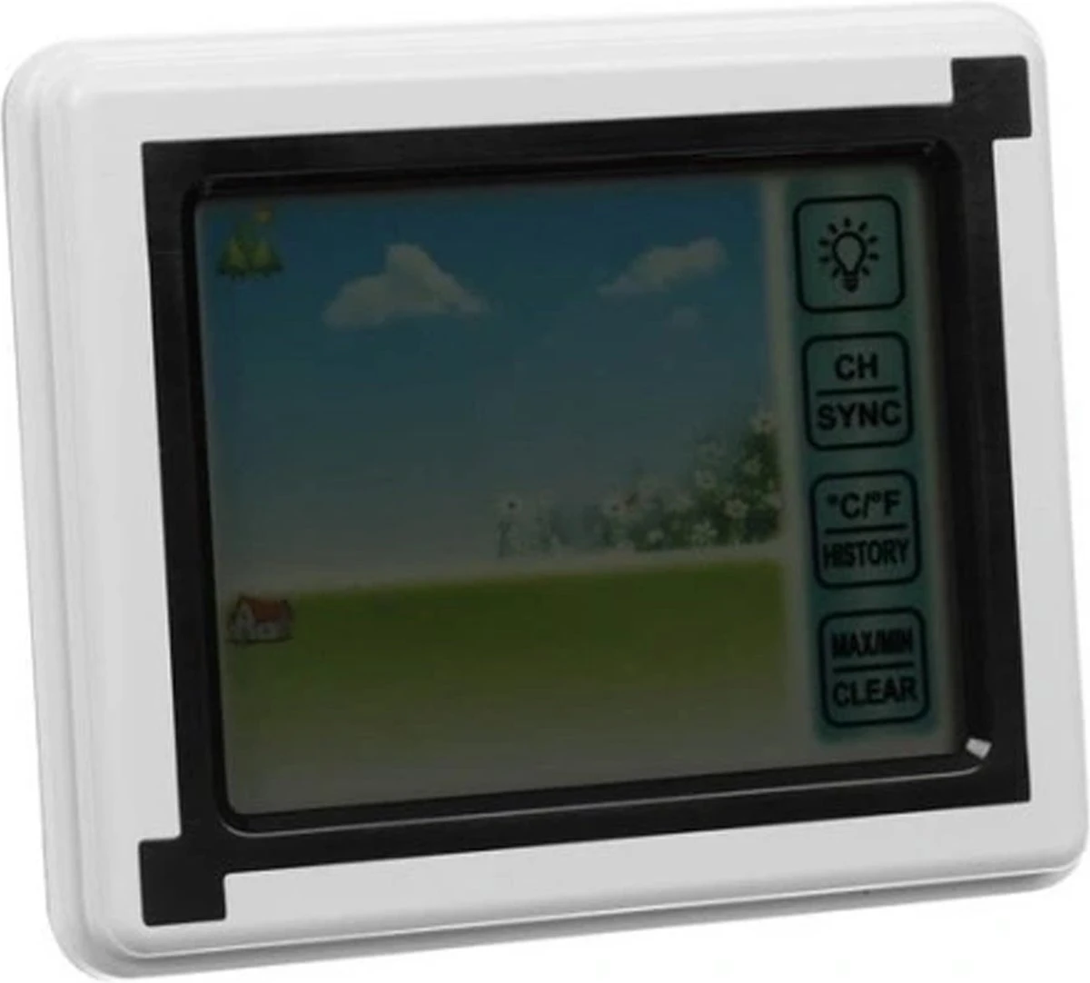 Modern en Praktisch – het draadloze weerstation is een modern en praktisch accessoire met een duidelijk display waarop u de gemeten waarden gemakkelijk kunt aflezen. Het apparaat is uitgerust met 4 knoppen: schermverlichting, ch/sync – kanaalselectie of leessynchronisatie, graden/geschiedenis – schakelen tussen meeteenheden, geschiedenis van records, max. min./clear – minimum en maximum records en optie voor het wissen van het geheugen.