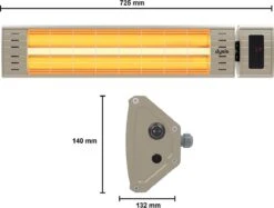 - IP 65 terrasverwarmer: Buitengebruik wordt gegarandeerd door de IP65 bescherming tegen regenwater, waterstralen, vuil en stof. Het heeft ook een kantel- en oververhittingsbeveiliging.