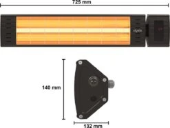 - IP 65 terrasverwarmer: Buitengebruik wordt gegarandeerd door de IP65 bescherming tegen regenwater, waterstralen, vuil en stof. Het heeft ook een kantel- en oververhittingsbeveiliging.