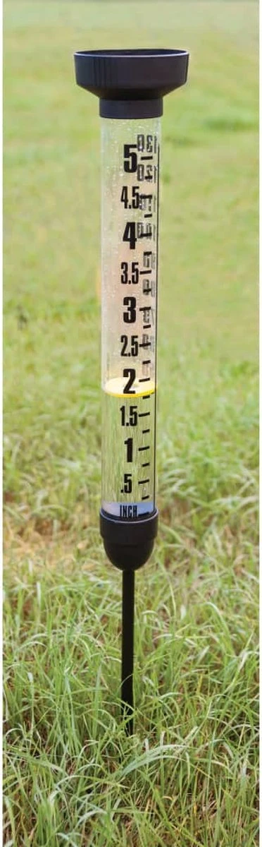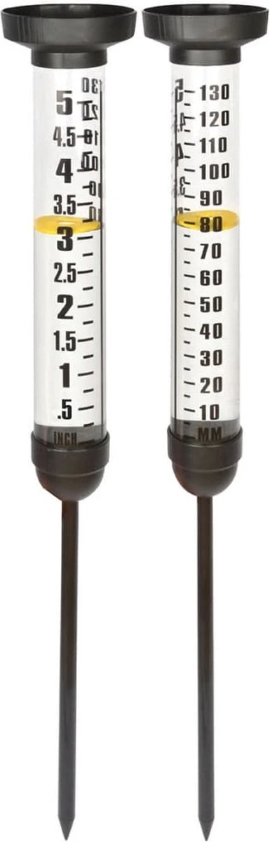 De pluviometer meet het neerslagniveau tot 130 mm en geeft de meting weer op de buis, in zowel milimeters als inches. Dankzij de gele vlotter kunt u de meter makkelijk aflezen.
