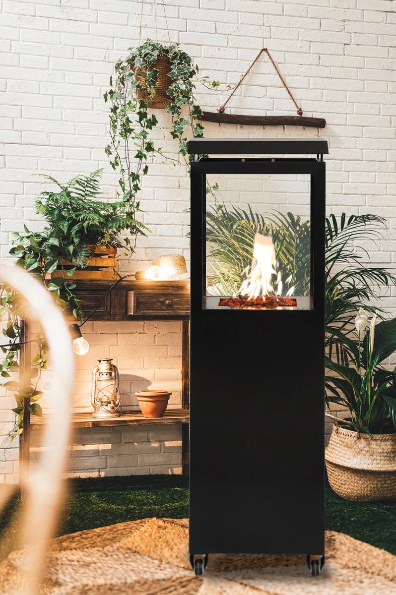Deze terrashaard is een aanwinst voor ieder terras. Dankzij het stijlvolle design en het vermogen van 6500 W hoeft niemand te zitten rillen van de kou. Bovendien is de terrashaard een streling voor het oog, want niets is leuker dan naar de opflakkering van de vlammen te zitten staren. Dankzij de beglazing rondom rond kan iedereen het vuur gadeslaan. Met de vier wielen onderaan verplaats je de terrashaard in een handomdraai. Lavastenen zijn inbegrepen om het totaalplaatje nog aantrekkelijker te maken en letterlijk en figuurlijk nog meer warmte te laten uitstralen.