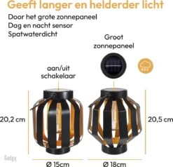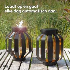Deze set solar tuinverlichting bestaat uit 2 schitterende zwarte metalen lantaarns voor buiten. De lampen zijn gemaakt van duurzaam metaal met een zwarte buitenkant en goudkleurige binnenkant, wat zorgt voor een schitterend warm lichteffect in het donker. De lantaarns hebben een grote lamp met gloeilamp-look, wat deze verlichting een hippe uitstraling geeft. Daarnaast zijn de lampen spatwaterdicht en dit maakt ze zeer geschikt voor gebruik in de tuin. Leuk voor jezelf of als cadeau voor iemand anders!