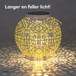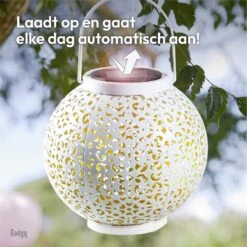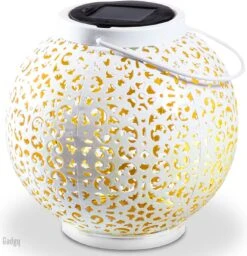 Deze mooie wit metalen Gadgy Solar lamp is een geweldige toevoeging voor jouw tuin of balkon. De ronde lantaarn met gouden binnenkant staat schitterend op de tuintafel en is ook op te hangen door middel van het handvat. De lantaarn is spatwaterdicht en is daardoor zeer geschikt voor gebruik in de tuin.
