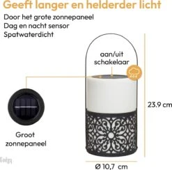 De Gadgy Solar Lantaarns zwart/wit zijn een schitterende decoratie voor je terras of tuin. Deze set bestaat uit 3 mooie lantaarns, met elk een ander ontwerp en metalen handvat. De lantaarns worden opgeladen door zonlicht, waardoor dit een duurzaam alternatief is voor lampen op batterijen en een veilig alternatief voor kaarsen. Zet eenmalig de schakelaar op ON en vervolgens gaan de lampen elke avond automatisch aan in het donker en uit zodra het licht wordt. Daarnaast zijn de lampen spatwaterdicht, waardoor je je niet druk hoeft te maken om een regenbui. Ook leuk als cadeau voor iemand anders!