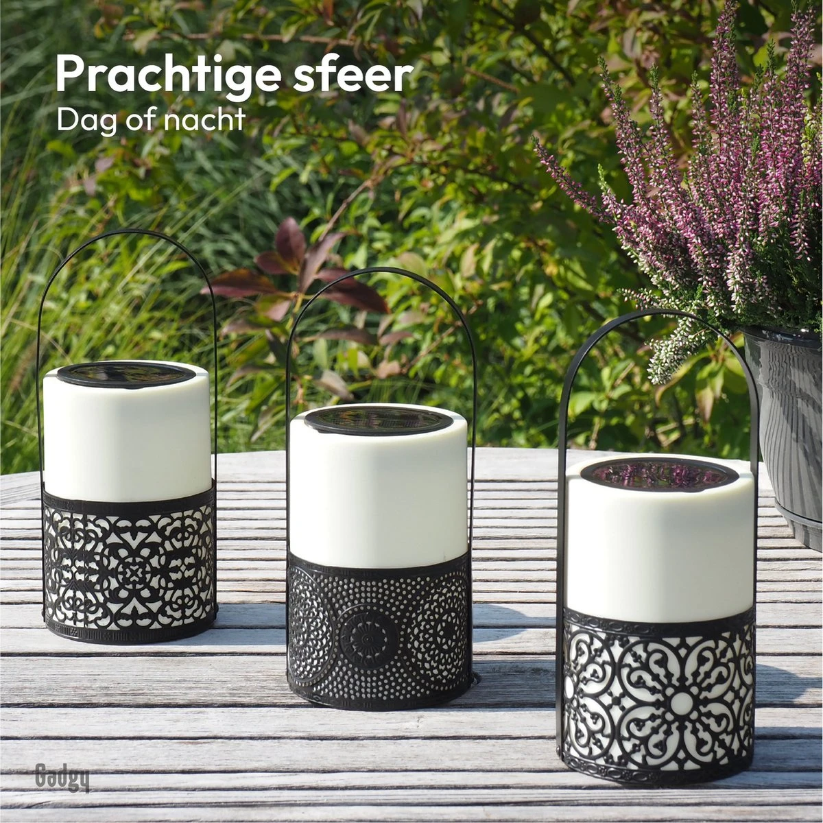 Set van 3 st. – In deze set zitten maar liefst 3 solar lantaarns met 3 verschillende ontwerpen.