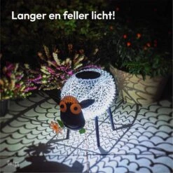 Energie Zuinig: de oplaadbare batterij van deze LED solar lamp in de rug van het schaap laadt overdag in de zon op en schijnt dan ’s avonds tot wel 8 uur lang.