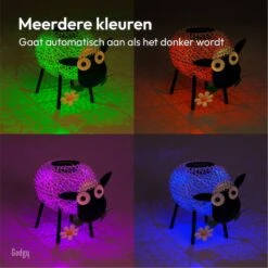 Dit mooie metalen schaap met bloem is overdag leuke tuindecoratie en ’s avonds mooie tuinverlichting! Haar kop is bevestigd aan een veer waardoor ze vrolijk heen en weer wiebelt. Witte en kleurrijke LED’s zorgen in het donker voor de juiste sfeer. Leuke buitenverlichting voor jezelf of als cadeau!