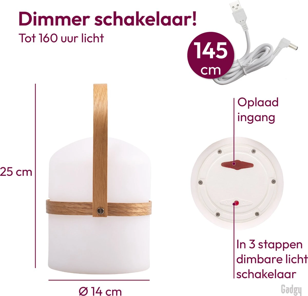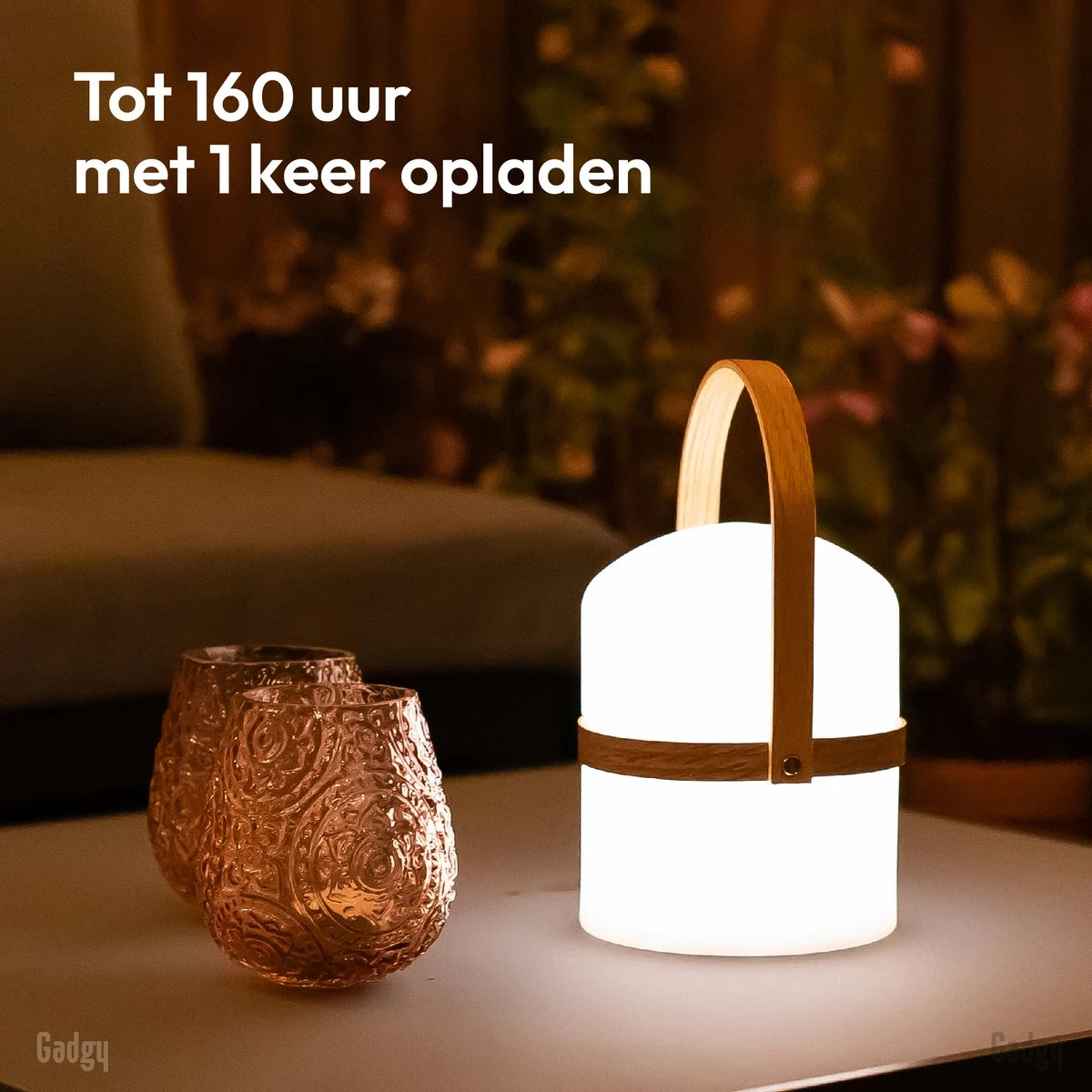 Geef meer sfeer aan je zomeravonden met deze fantastische lamp! Verlicht je huis, tuin of iedere andere plek buiten met deze mooie oplaadbare tafellamp van Gadgy. Het heeft een stevig handvat gemaakt van bamboe waaraan je de lamp overal mee naar toe kunt nemen en op kunt hangen waar je maar wilt. Volledig opgeladen brandt deze lamp wel tot 160 uur! Dat is veel langer dan ieder andere soortgelijke lamp. De lamp is daarbij ook nog dimbaar zodat het te gebruiken is als helder licht, maar ook te dimmen is tot een hele gezellige sfeerlamp. Ook handig om mee te nemen naar de camping of andere vakantie!