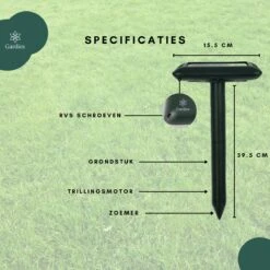 De ultrasone mollenverjager verjaagt met behulp van variabele ongelijke frequentie stimulatie & ondergrondse trillingen die zich om de zoveel seconden uitzendt. Hierom zullen de ongewenste dieren op een diervriendelijke manier weg gaan Zo bestrijdt de dierenverjager ongewenste dieren zoals mollen in je tuin, gazon of omgeving. Doordat de mollen voornamelijk in de avonden actief zijn, zorgt de mollenverjager dat die door middel van zonne-energie overdag opgeladen wordt zodat die in de avond uren kan werken. Wat uiteindelijk een rustgevend gevoel creëert voor zowel jou als je tuin.