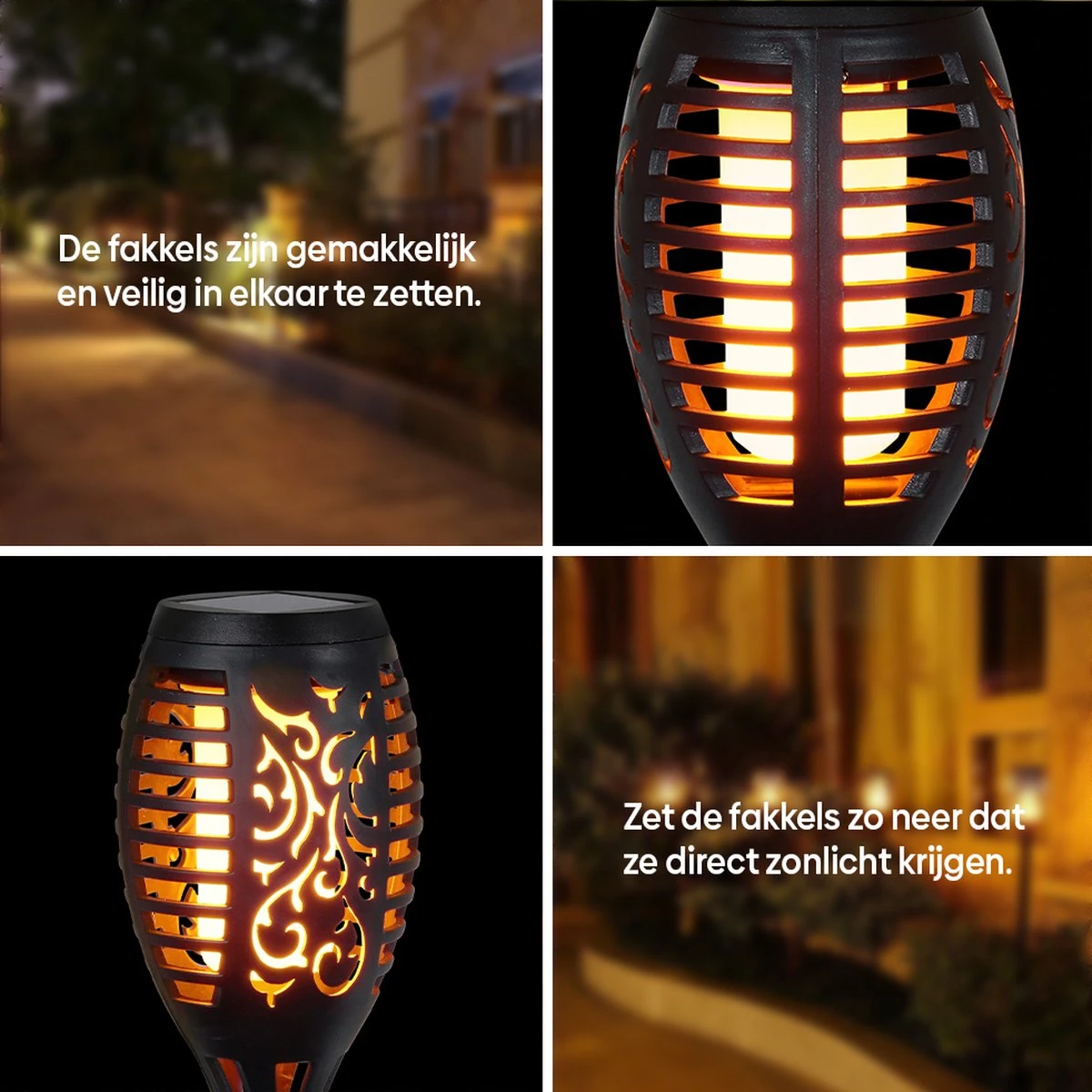 Het is een mooie decoratieve set die heel makkelijk te installeren is zonder enig onderhoud. Wanneer u de fakkels plaatst, moet u ervoor zorgen dat deze zoveel mogelijk licht ontvangen. Hierna is het enkel genieten van uw sfeervolle tuin! De fakkels zullen een licht produceren wat beweegt als een echte vlam. Wanneer u thuiskomt na een lange dag, zal het een rustgevende en warme sfeer creëren.