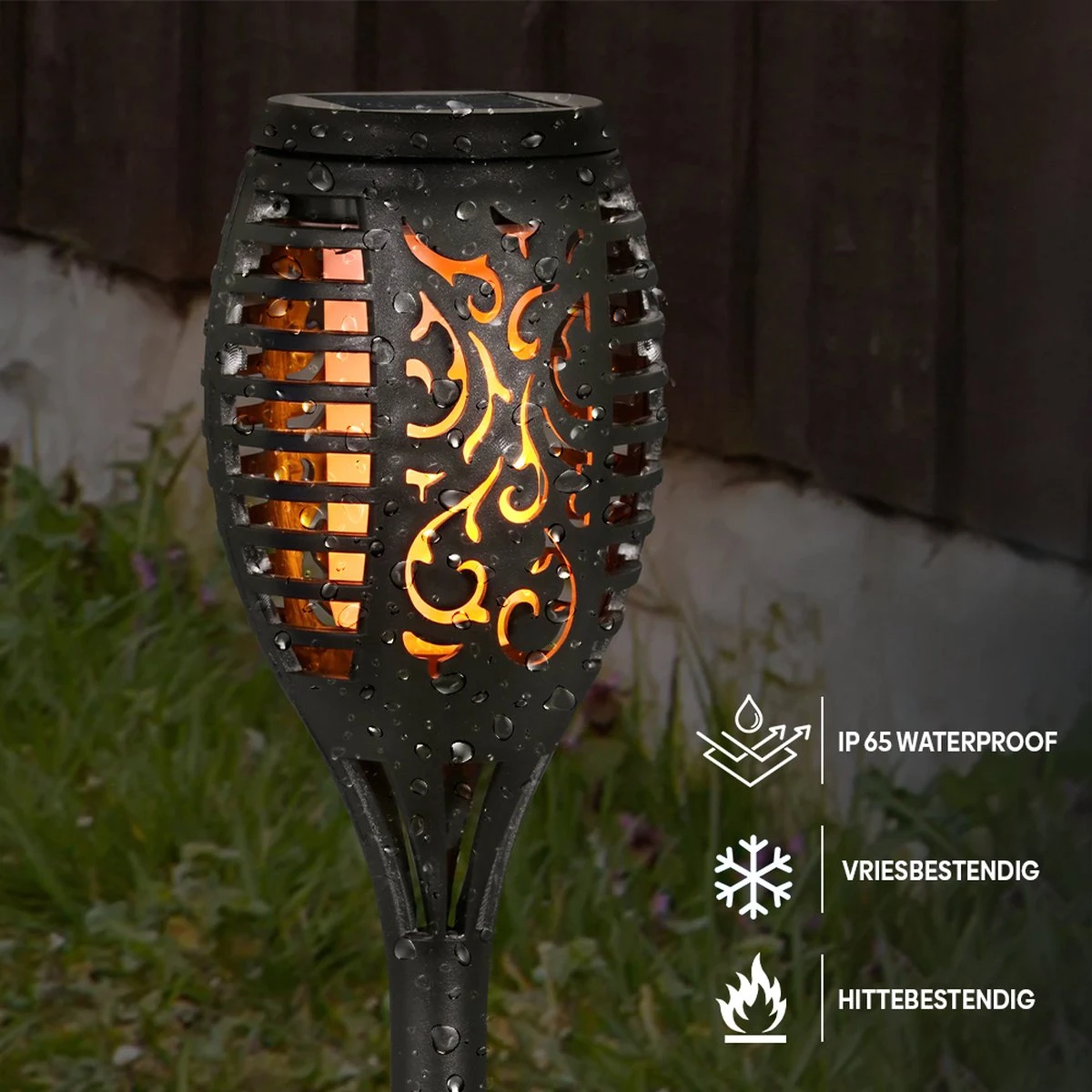 De fakkels zijn waterdicht en bestendig voor elk type weer. Bij zonsopkomst zullen de lichten automatisch dimmen, en bij schemering zullen zij aangaan. Het zijn amorfe zonnepanelen, dit is een sterke kunststof en is daardoor uiterst geschikt voor buitengebruik.