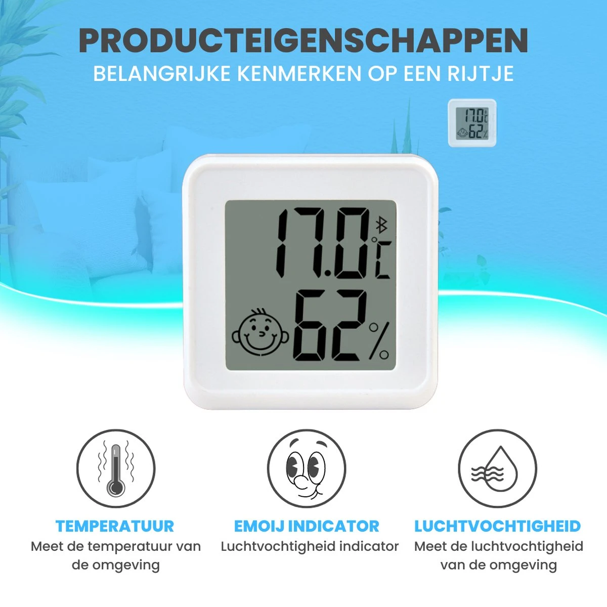 - Houdt uw omgevingsfactoren perfect bij – Doordat de hygrometer met bluetooth te gebruiken is kunt u de omgevingsfactoren in uw woning perfect bijhouden via uw telefoon. In de app wordt zowel de luchtvochtigheid als de temperatuur duidelijk weergegeven.