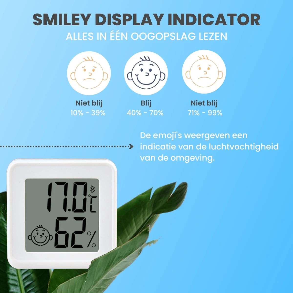 Op de luchtvochtigheidsmeter voor binnen leest u in één oogopslag de luchtvochtigheid en de temperatuur in huis af. Daarnaast is er ook een emoji indicator met 2 verschillende gezichtsuitdrukkingen aanwezig die laat zien of het luchtcomfort positief of negatief is. Hierdoor weet u direct waar u aan toe bent en of u aanpassingen moet doen om het luchtcomfort te verbeteren.