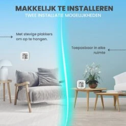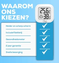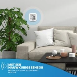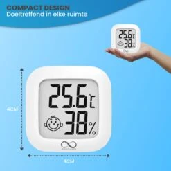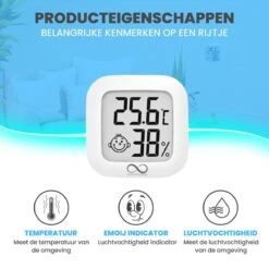 - Gemakkelijk te bevestigen – De compacte hygrometer is erg eenvoudig te bevestigen m.b.v. een plakstrip aan de achterzijde. Daarnaast kan de hygrometer ook neergezet worden op een centrale plek in uw woning. Zo heeft u de vrijheid om de luchtvochtigheidsmeter te gebruiken waar u maar wilt.