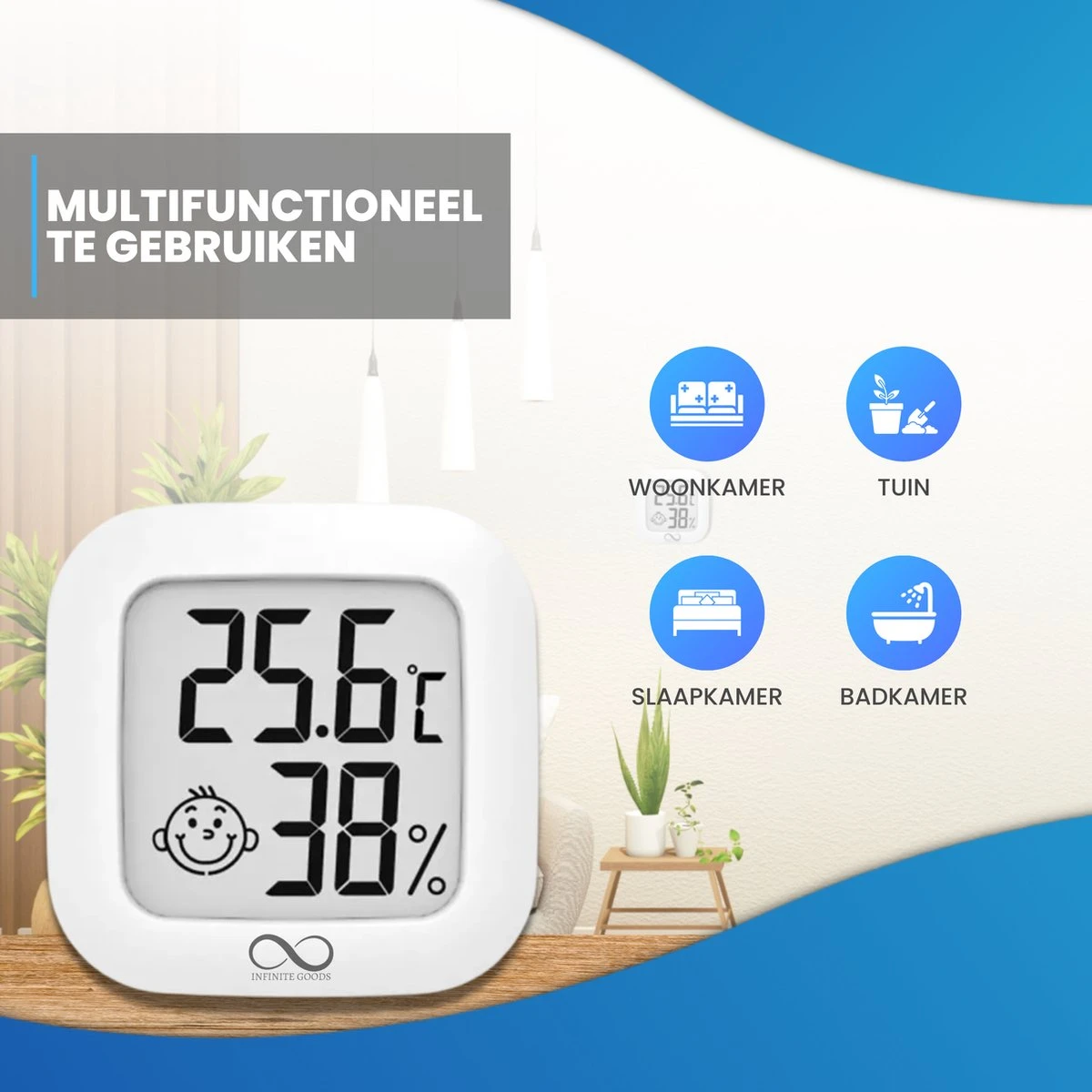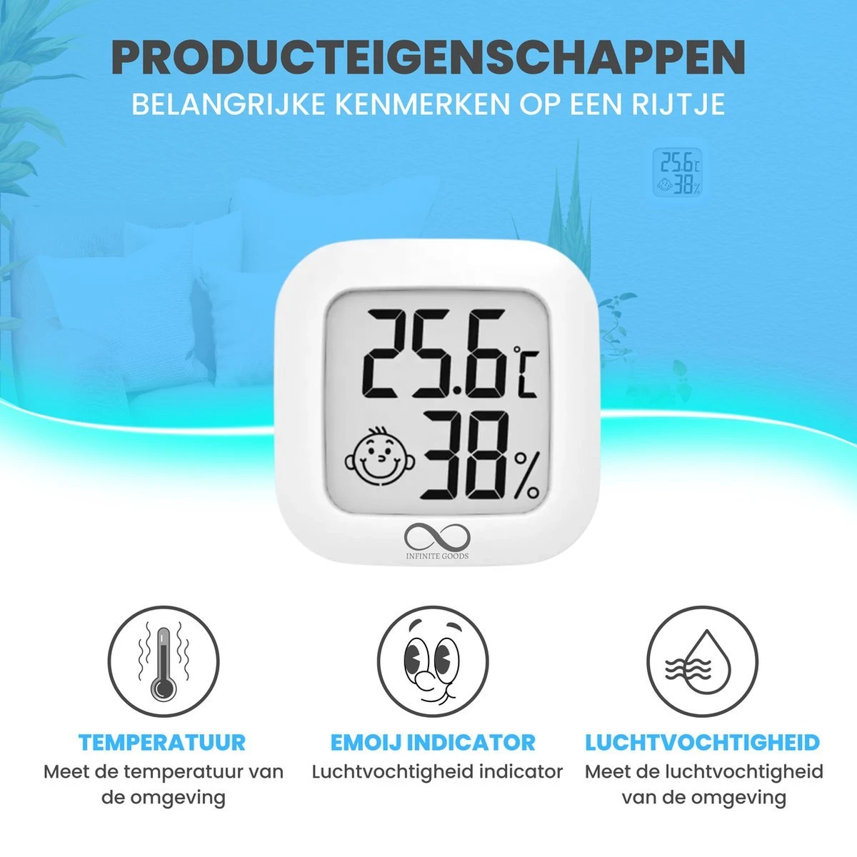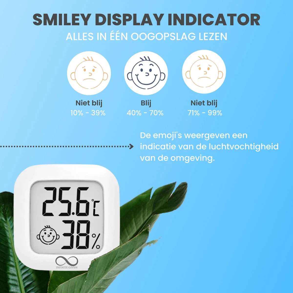 Hoe weet u nou of uw leefomgeving van positieve invloed is op uw gezondheid? Met deze Infinite Goods hygrometer zal u het antwoord op deze vraag snel te weten komen! Deze luchtvochtigheidsmeter is een handig apparaat voor de monitoring van de leefomstandigheden van u en uw familie, meet altijd zeer snel en nauwkeurig en laat alle gegevens in één oogopslag zien.