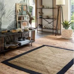 Jute kleed met zwarte rand van katoen. Mooi kleed met warme uitstraling voor je interieur. Afmeting: 170 cm x 120 cm
