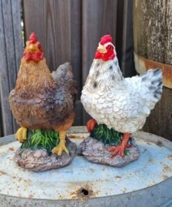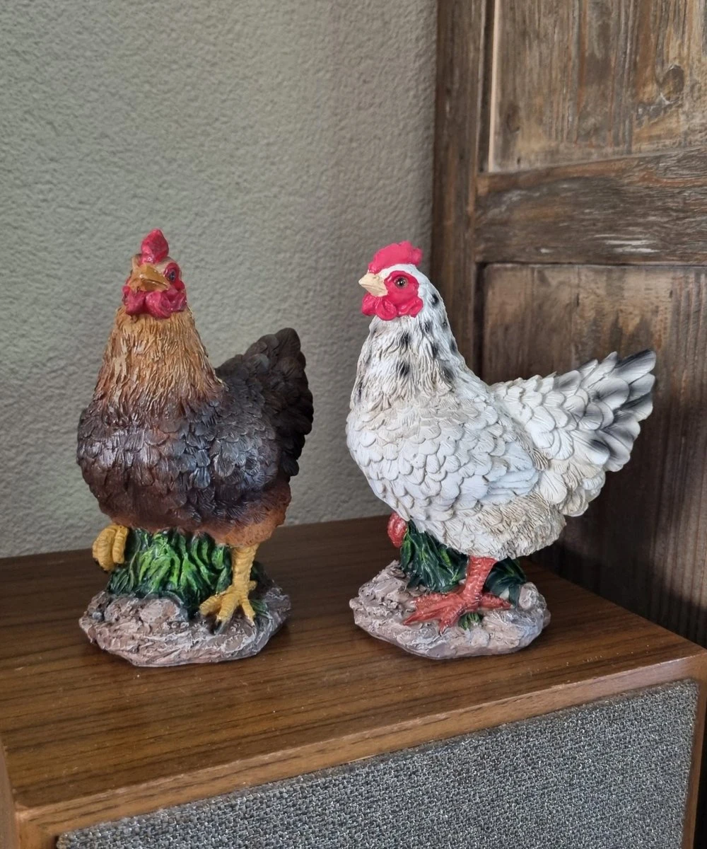 Ben je op zoek naar een kip beeld als decoratie? Deze twee prachtige nieuwsgierige kippen beelden als set fleuren je interieur binnen of buiten als tuinbeeld direct op! Met hun afmetingen van 17 cm zijn het ware eyecatchers, waar je ze ook neerzet!