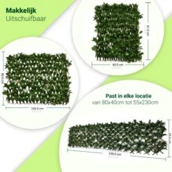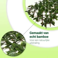 Deze Laurier kunsthaag van Holland Depot is een luxe haag binnen de huis- en tuindecoratie. Het is gemaakt van echt bamboe voor een natuurlijke uitstraling. De bladeren zijn om het bamboe heen gewoven, hierdoor is er geen lijm nodig en laten de bladeren niet los. Geen zorgen of de haag past, de Laurier kunsthaag kan uitgeschoven worden tussen de 80x40cm tot 55x230cm. Bij deze levering zitten 9 tie wraps en een draagtas om de haag te verplaatsen.