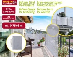 Op mooie dagen van je balkon genieten zonder je zorgen te maken om schadelijke UV-stralen en pottenkijkers? Het kan met het Lifetime Garden balkonscherm in grijs. Het balkonscherm geeft je extra privacy en luwte om van je balkon genieten. Het balkondoek is 75 centimeter hoog en 6 meter lang. Het scherm is gemaakt van UV-resistent kunststof doek (120g/m2 polyethyleen) met een geweven structuur, waardoor een licht briesje nog wel voor enige verkoeling kan zorgen op warme dagen. Je hangt de beschutting op aan je balkonrand door het meegeleverde 24 meter lange touw te vlechten door de 24 aluminium ogen in het doek.