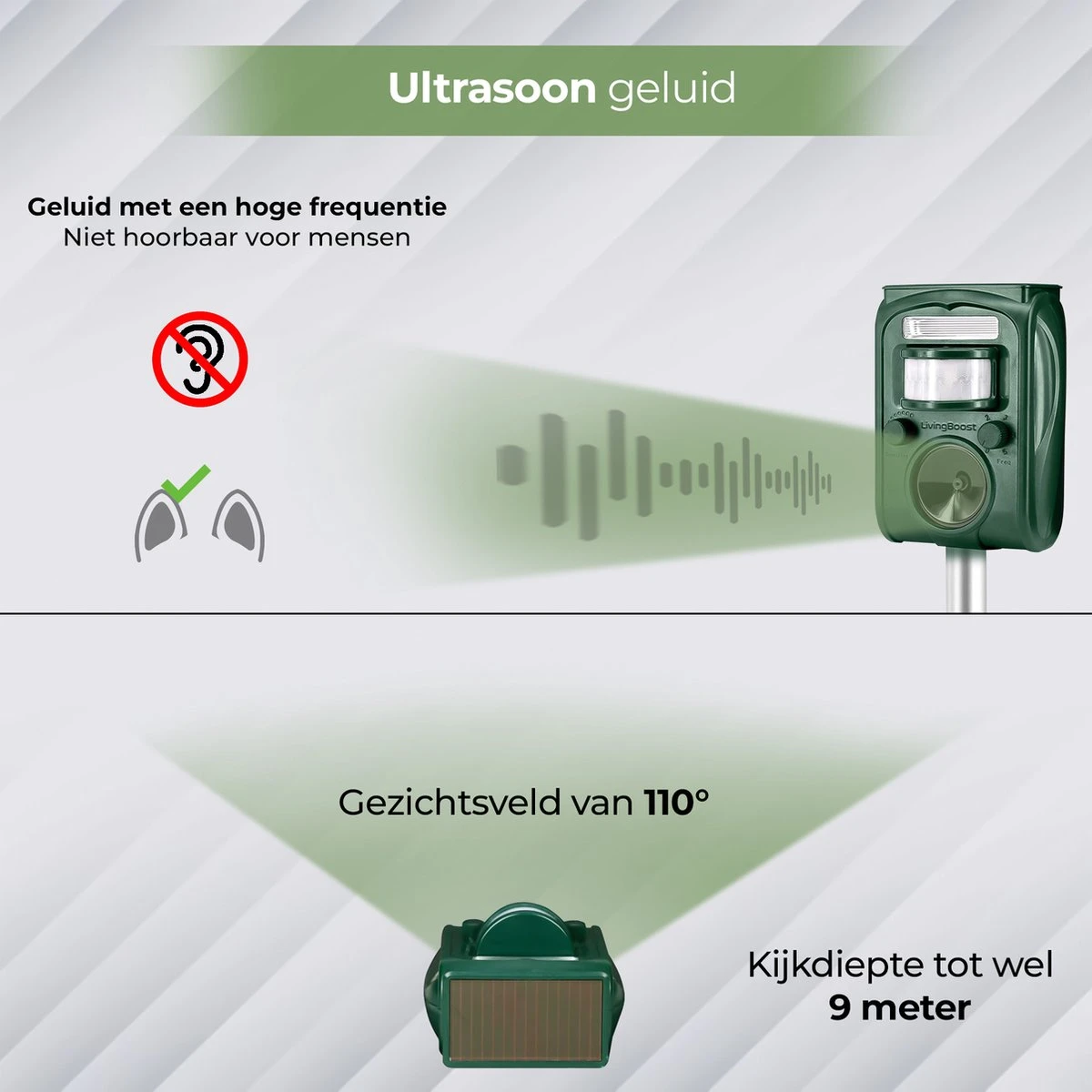 Maak kennis met de LivingBoost© Kattenverjager. Dit diervriendelijke apparaat laat de ultieme rust in uw tuin wederkeren. Doormiddel van ultrasoon geluid kunnen ongewenste dieren verjaagd worden en zult u voortaan geen ongure uitwerpselen meer ruiken in uw tuin! Dankzij onze Passive Infrared Sensor kunnen dieren op een efficiënte manier verjaagd worden, zonder dat de mens hier last van heeft. Bestel vandaag nog en profiteer morgen van deze diervriendelijke kattenverjager. Zeg vaarwel tegen ongedierte en uitwerpselen in uw tuin!