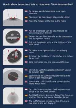 • LUMIZ kan bij optimale omstandigheden met 6-8 uur oplaadtijd door direct zonlicht ook 6-8 uur branden. Het licht kan na 5-6 uur branden afnemen in sterkte.