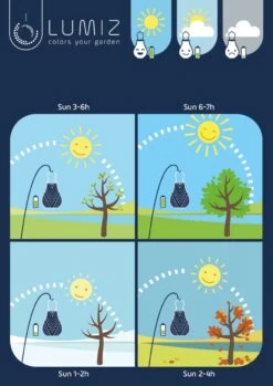 • In de zomer schijnt de zon vaker en langer, waardoor de lampion meer energie kan opnemen en dus langer kan branden dan in de andere seizoenen. Op zonnige winterdagen zal de LUMIZ ook kunnen branden, weliswaar staat de zon lager en zullen de branduren wat minder zijn.