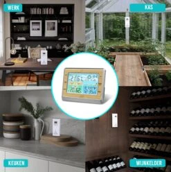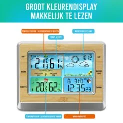 Wil jij zowel binnen- als buitenshuis de temperatuur en de vochtigheidsgraad zien? Blijf je graag op de hoogte van de weersverwachting? Ben je op zoek naar een hygrometer met extra’s? Op dit multifunctionele weerstation kun je de temperatuur, luchtvochtigheid, luchtdruk, tijd, datum en maanfases aflezen. Het kleurendisplay met pictogrammen is makkelijk af te lezen. De helderheid kun je zelf instellen wanneer aangesloten via usb. Wordt geleverd met buitensensor. Een handig, multifunctioneel item waarmee je op elke weersomstandigheid voorbereid bent!