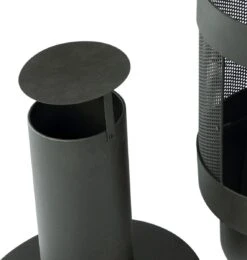 De zijkanten van de haard zijn voorzien van gaas zodat de vlammen beheerst worden en kinderen of dieren beschermd blijven tegen het vuur. Een zijde van het gaas is open om hout en kolen bij te vullen.