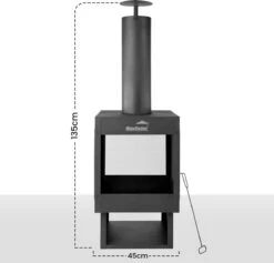 De schoorsteen zorgt ervoor dat de rook perfect wordt afgevoerd en is voorzien van een regenkap waardoor inregenen voorkomen wordt. Onder de haard is genoeg plek om bandhout op te slaan.