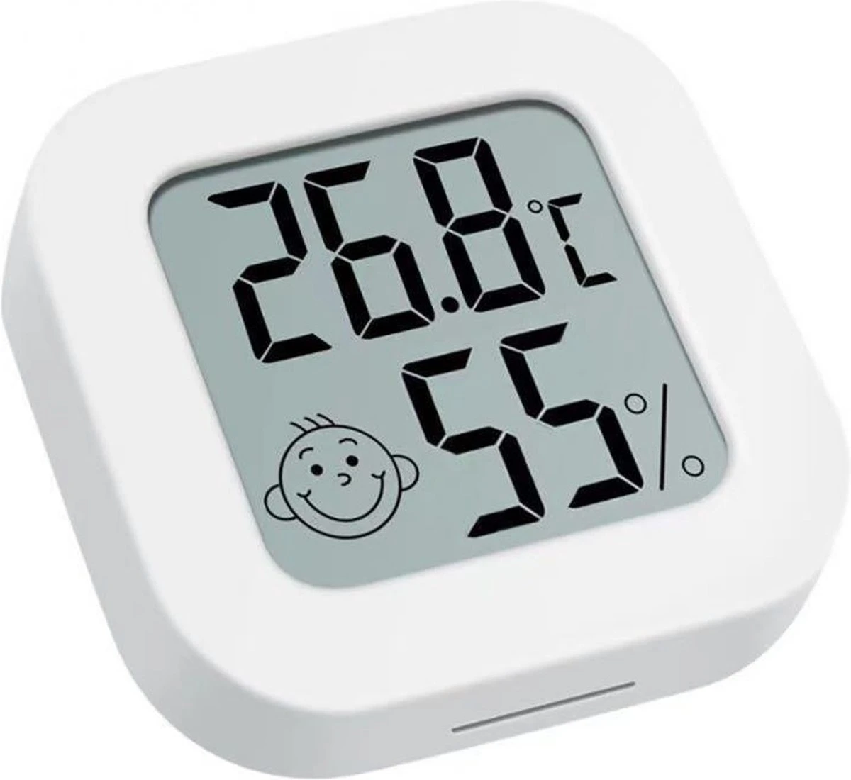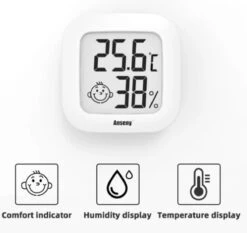 De meter is gemaakt van ABS plastic en is klein maar fijn. De afmetingen zijn namelijk 45 x 45 x 13 mm. Het temperatuurbereik loopt van -10℃ tot +70℃ met een resolutie van 0.1℃ en een nauwkeurigheid van ±1℃. De luchtvochtigheid kan gemeten worden van 10% tot 99% met een resolutie van 1% en een nauwkeurigheid van ± 5%.