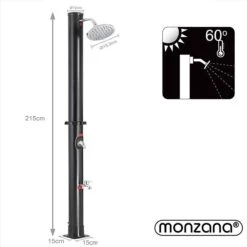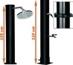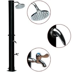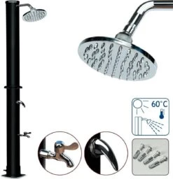 Deze duurzame douche kan het water opwarmen tot 60° met behulp van zonne-energie. Sluit eenvoudig de tuinslang aan en de douche-ervaring kan beginnen. Met de temperatuurregelaar kan je continu de temperatuur van de douche veranderen. Er bevindt zich ook een kraan aan de onderkant voor als je alleen de voeten hoeft af te spoelen.