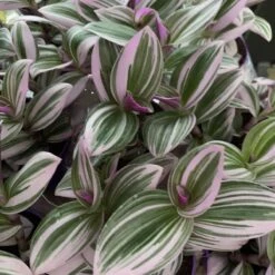 De Nanouk is een van de meest opvallende Tradescantia’s. Met zijn wat grotere, dikkere bladeren wijkt hij wat af van zijn familieleden. Zijn paars/roze strepen en onderkant van het blad geven hem een zeer aparte uitstraling. Deze hangplant groeit zeer snel, is makkelijk te stekken en houdt van veel licht. Voor deze Tradescantia telt: Hoe meer licht hoe meer kleur. Pas wel op met direct zonlicht in de zomermaanden.