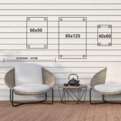 De tuin schilderijen worden gemaakt van PVC. Daardoor krijg je een tuinposter met heldere kleuren. Het poster materiaal is stevige en opvouwbaar, uv-bestendig en waterafstotend. Al onze tuinposters zijn verkrijgbaar in meerdere formaten, van klein ( 40 x 60 cm) tot groot (80 x 120 cm). In iedere hoek van het doek is een ring geplaatst, zodat je het doek eenvoudig op kan hangen. Door de speciale coating zijn onze tuinposters minimaal drie jaar weersbestendig.