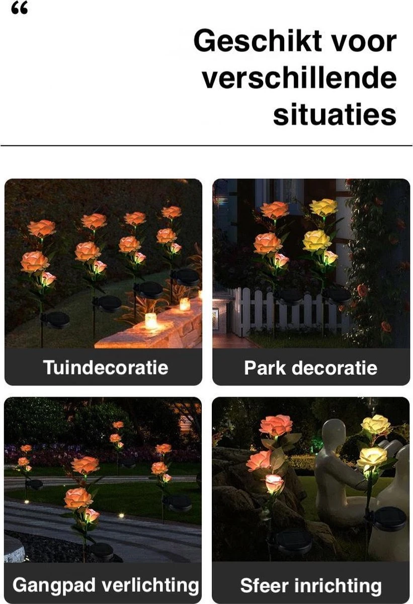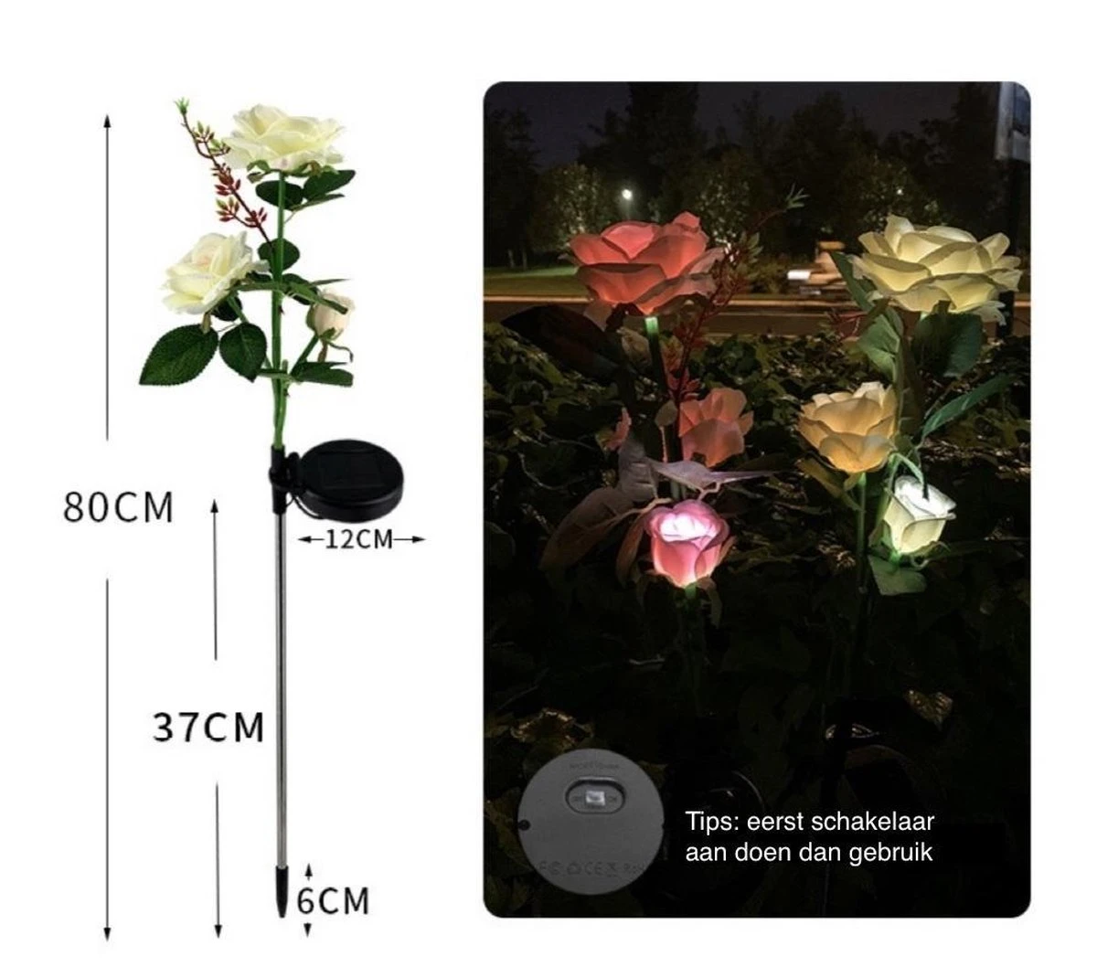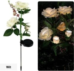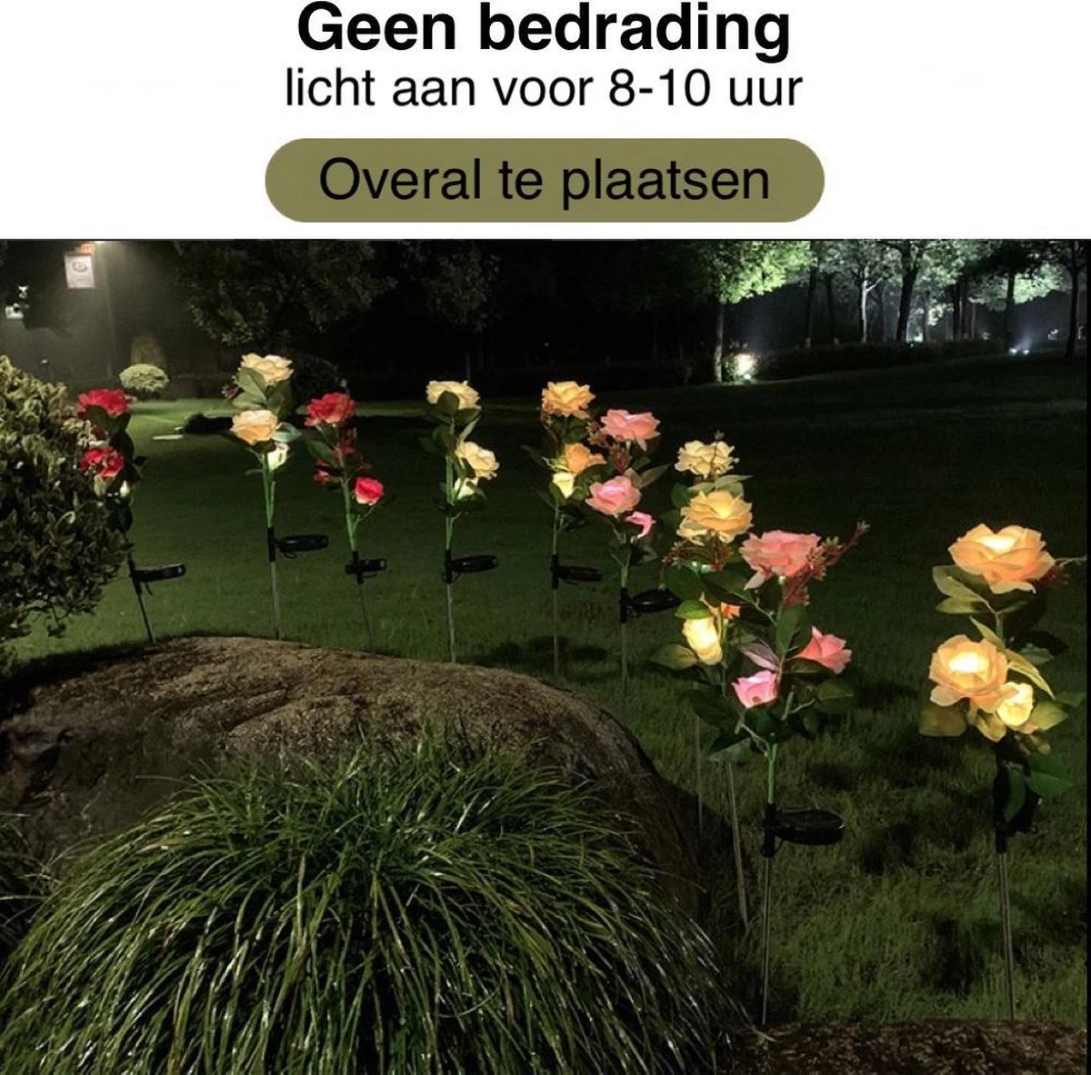 Iedereen wil wel eens zijn of haar tuin mooi en speciaal verlicht worden zonder extra elektriciteitskosten. Dan is deze set van 2 rozen lampen de perfecte keuze voor uw tuinverlichting. Deze lampen worden namelijk opgeladen via zonne-energie. Naast verlichting zijn deze rozen lampen ook perfect voor sfeer inrichting. U kunt deze rozen lampen overal gemakkelijk te plaatsen naar uw wens. Verder zijn deze rozen lampen geschikt voor buiten. Ze zijn waterdicht en kunnen goed tegen het slechte weer.