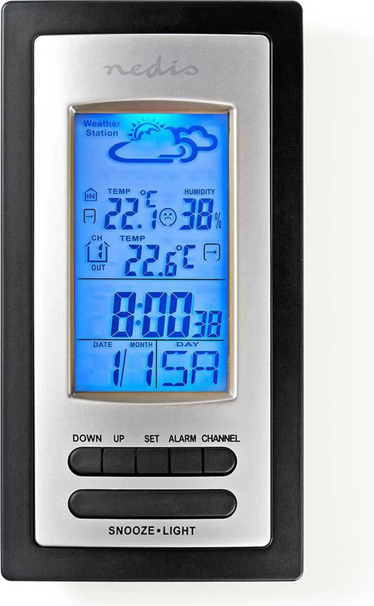 Weerstation om op de hoogte te blijven van de laatste weersinformatie. Het weerstation werkt met een aparte sensor en een zender en geeft zowel de binnen- als de buitentemperatuur weer. Het beschikt bovendien over een hygrometer die de luchtvochtigheid in een kamer meet. Het weerstation is tevens uitgerust met een kalender en een alarmklok met een sluimerknop, en is daardoor erg handig voor zowel thuis als op kantoor.