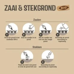 Zaaien: Strooi de grond in het zaaibakje (80%). Druk de zaadjes in de grond. Dek de zaadjes toe met een dun laagje grond. Bevochtig de grond voorzichtig en regelmatig. Stekken: Plaats de stek in de grond en druk de grond licht aan. Bevochtig de grond voorzichtig en regelmatig.